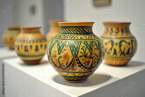 Yellow and Green Ceramic Vases with Intricate Patterns on White