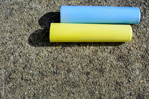 Yellow and light blue chalk sticks on asphalt, flat lay. Space for text