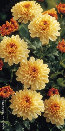 yellow and orange chrysanthemums growing in a garden. The flowers are seen from a side view
