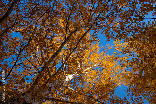 Yellow birch tree and blue sky in the fall. Beautiful bright autumn view with leaves and branches lit by natural sunlight.