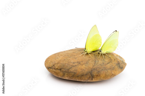 Yellow butterfly on stone with white background