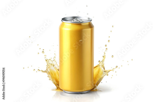 yellow can of soda with water splashing on it