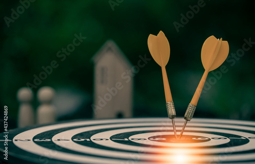 Yellow dart arrows hitting in the target center of dartboard with modern people and real estaste background.