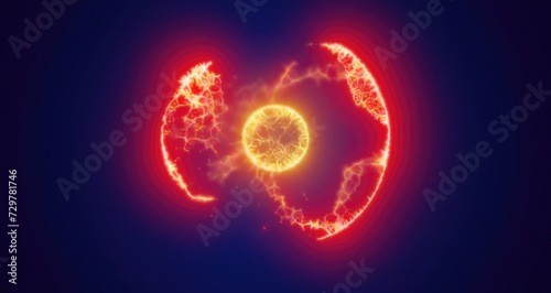 Yellow energy magic circle, sphere, ball made of futuristic waves and lines of particles of atomic energy and electricity force field. Abstract background
