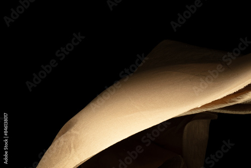Yellow gold curtain fabric flying in curve shape, Piece of textile yellow gold curtain fabric throw fall in air. Black background isolated, dark shading environment