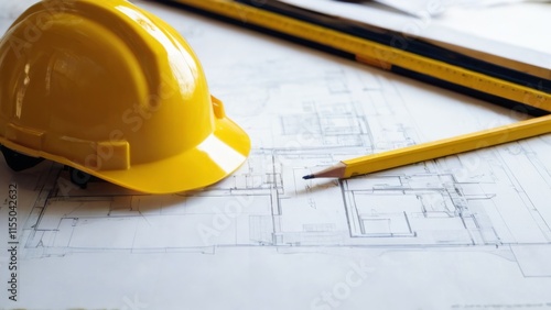 Yellow hard hat, blueprints, and rulers on white surface with blurred construction items in background.