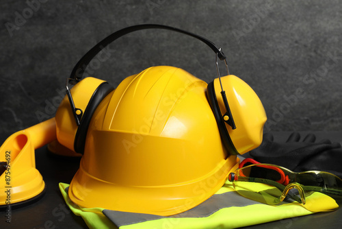 Yellow hard hat, earmuffs and other personal protective equipment on black surface, closeup