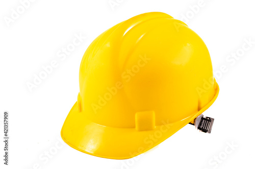 Yellow hard hat for construction workers. Protective clothing and accessories for employees.