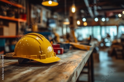 Yellow hard hat sitting on workbench in workshop