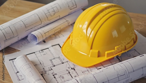 Yellow hardhat on blueprints; planning, construction, architecture; wood table background; for construction industry