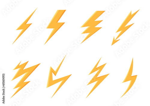 Yellow lightning icons set. Warning symbols. Danger and alarm. Electricity and voltage, power, energy. Symbol of speed and strength. Cartoon flat vector collection isolated on white background