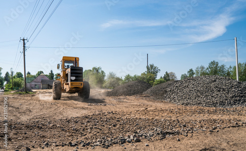 Yellow loader moving with uploaded bucket with stone gravel during road construction works. The stones for the road. Unloading stone.