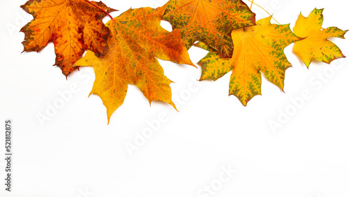 Yellow maple leaves in a line on a white background, autumn border framing for your text or design