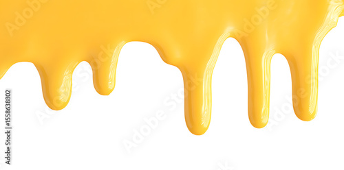 Yellow melted cheese drips and flows down from the top edge, isolated on white background. Realistic melted cheese dripping in smooth, creamy ribbons, isolated on a clean white background. Perfect for