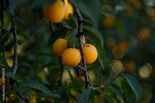 yellow mirabelle plums on the green tree branch in the garden