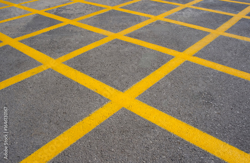 Yellow parking lot lines create a geometric pattern on asphalt surface, showcasing urban design and organization in a public space with copy space