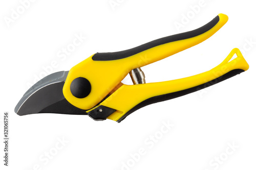 Yellow pruning shears, garden secateurs or hand pruners are garden tools used in gardening for cutting tree branches and landscaping gardens, isolated on white background