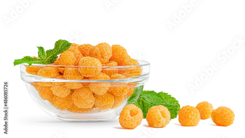 Yellow raspberries in a transparent bowl isolated on white background with clipping path.