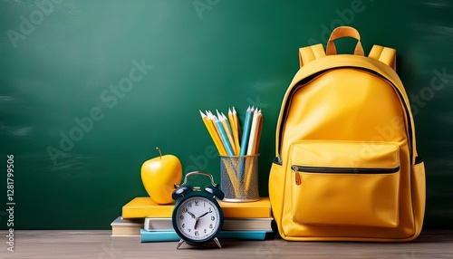 yellow school backpack against a green board next to an alarm clock pencils and books banner with space for your text back to school