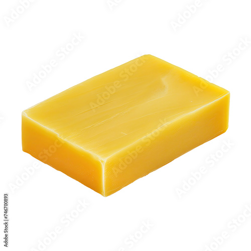 Yellow soap isolated on a white or transparent background. Rectangle soap for washing dishes or hands close-up. A design element to be inserted into a design or project.