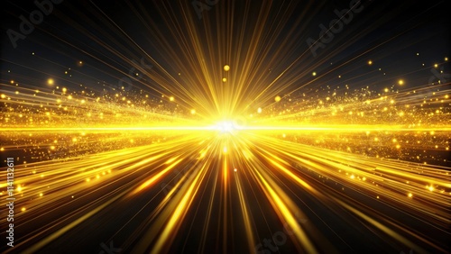 Yellow speed lines and particles emanating from lights in a blank spot on a black background. rendering