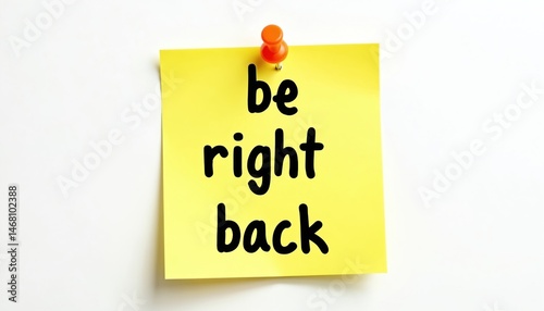 Yellow sticky note with handwritten message Be Right Back pinned to white surface. Reminder for office absence or temporary unavailability. Communication, notification, announcement, waiting concept.