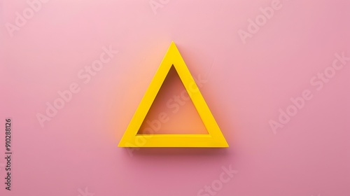 Yellow triangle shape on pink background. A simple, yellow triangular shape stands out against a light pink backdrop, offering a minimalist and geometric design element.
