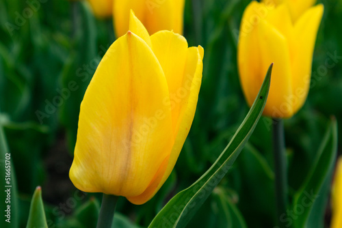 Yellow tulip close-up in leaves greenery, vivid flower view with blurred background. Tender botanical foliage in spring garden