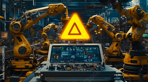 Yellow Warning Triangle Glows Amidst Robotic Arms in Industrial Factory Setting