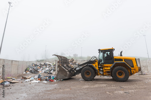 Yellow wheel loader, with lifted scrap grapple, moving along the recycling center area in process handling dumped waste