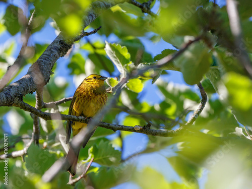 Yellowhammer sitting on a tree branch in a lush foliage tree