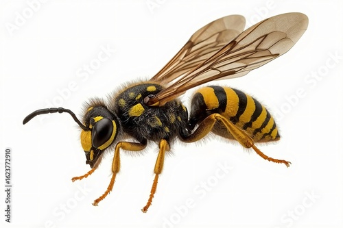 Yellowjacket wasp flying, studio shot, white background, insect pest control
