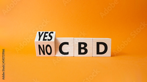 Yes or No CBD symbol. Wooden cubes with words No CBD or Yes CBD. Beautiful orange background. Business and Yes or No CBD concept. Copy space.