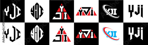 YJI letter logo design in six style. YJI polygon, circle, triangle, hexagon, flat and simple style with black and white color variation letter logo set in one artboard. YJI minimalist and classic logo