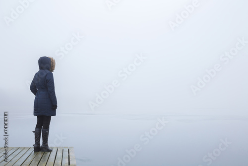 Young adult woman standing on edge of footbridge and staring at lake in cold day. Mist over water. Foggy air. Peaceful atmosphere. Spending time alone in nature. Empty place for text. Back view.