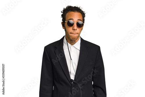 Young African American bodyguard man isolated confused, feels doubtful and unsure.
