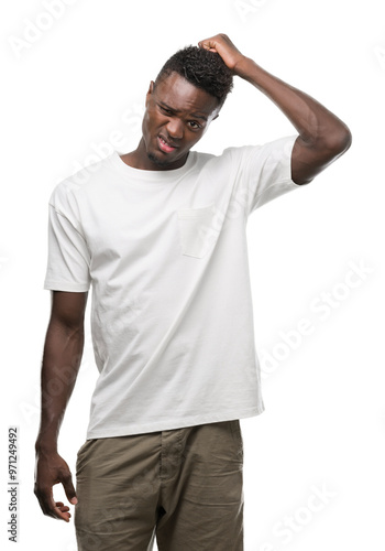 Young african american man wearing white t-shirt confuse and wonder about question. Uncertain with doubt, thinking with hand on head. Pensive concept.