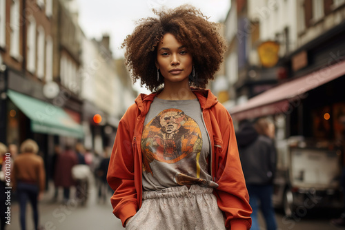 Young African American woman with afro hairstyle and 80s style clothes, street portrait