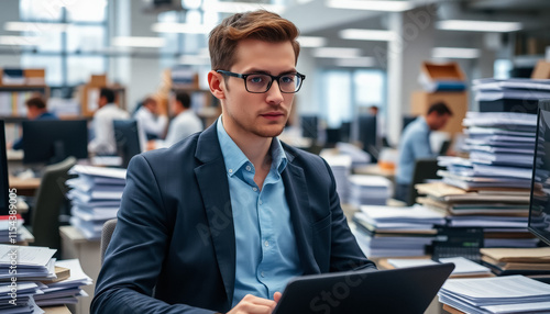 Young analyst seated at a busy office desk surrounded by reports, working on detailed analysis and strategic planning.