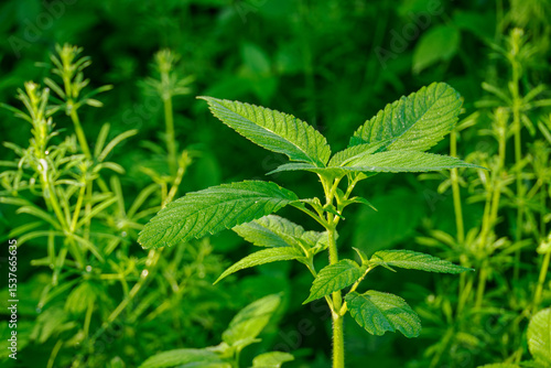 Young and fresh green leaves of dead-nettle with bedstraw in the background.
