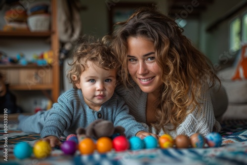 Young and radiant mother enjoys playful time with her toddler amid a bunch of bright colorful play balls