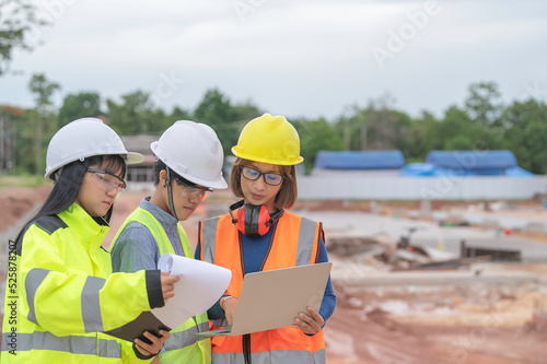 Young and senior Engineers discuss about work of large building underconstruction,Three people working on site of under construction