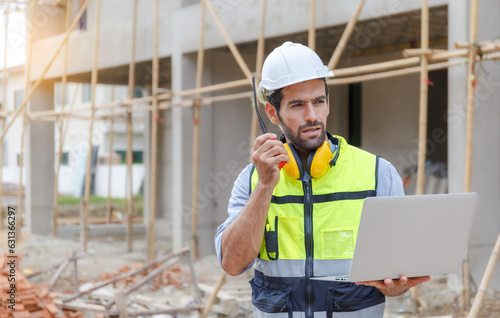 Young architect engineering consultant using laptop on construction site inspecting building, inspecting, designing and planning
