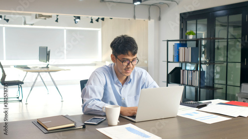 Young asian businessman smiling while working with laptop computer at office, business office lifestyle concept