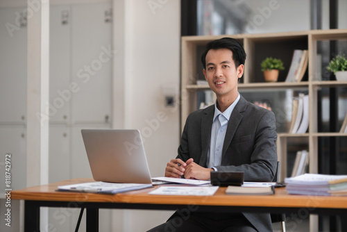 Young Asian businessman working using laptop in modern office, analyzing accounts Financial investment information report