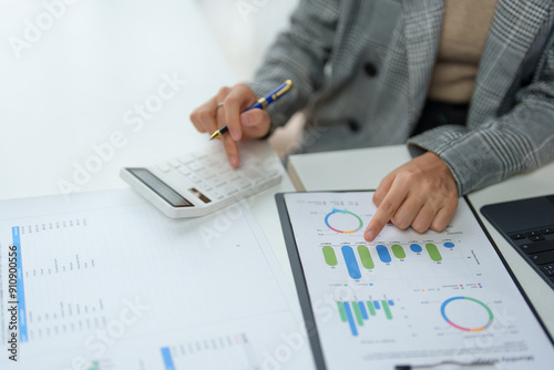 Young Asian businesswoman uses a calculator to calculate business principles. Accounting statistical concepts at the office starting a financial business, calculating accounting online marketing.