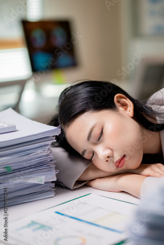 Young Asian office worker sleeping on desk with pile of documents after working hard on computer