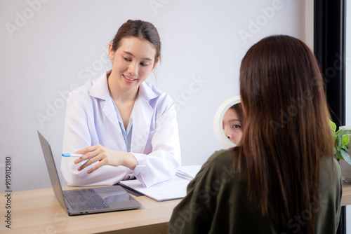 Young asian patient woman consulting with doctor in coat about wrinkle and skin for rejuvenate and beauty while watching laptop in modern medical office, doctor explaining and diagnostic facial.