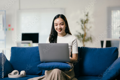 Young asian woman is working remotely, sitting on a blue couch in her modern apartment, looking at her laptop computer and smiling