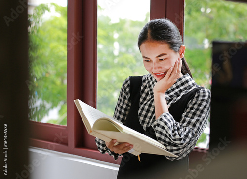 Young asian woman reading book in the library.